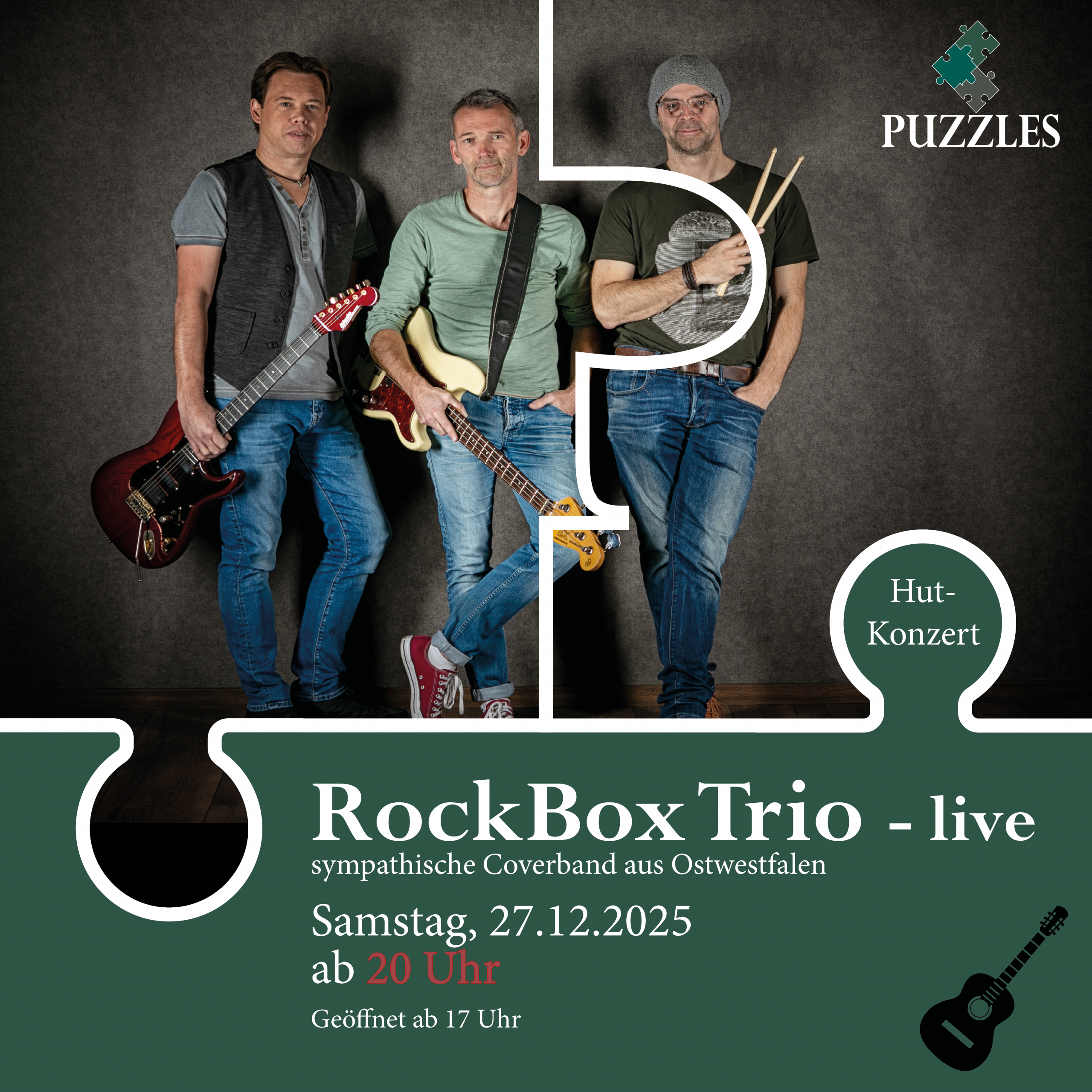 Puzzles Brilon Petrusstraße 1, Brilon, NRW, DeutschlandRockBox Trio – live Samstag, 27.12.2025 ab 20 Uhr Geöffnet ab 17 Uhr Zum Jahresende haben wir noch ein Konzert für euch. RockBoxTrio ist die sympathische Coverband aus Ostwestfalen. Ob Privatpartys, Kneipenfestivals, Vereinsfeiern, Dorf- oder Stadtfeste, das Trio rockt jedes Event. Die Dreiercombo performt Rock-Hits der 80/90er mit viel Spaß und Leidenschaft, alles 100% live, authentisch und ohne Kompromisse. Auf der Setlist stehen Songs von Queen, Green Day, The Police, Billy Idol, U2 u.v.a. Nur Gitarre, Bass, Schlagzeug und zwei Stimmen – mehr braucht es nicht für einen druckvollen Rocksound! Der Eintritt ist frei! – Hutkonzert. Eure Puzzles Crew