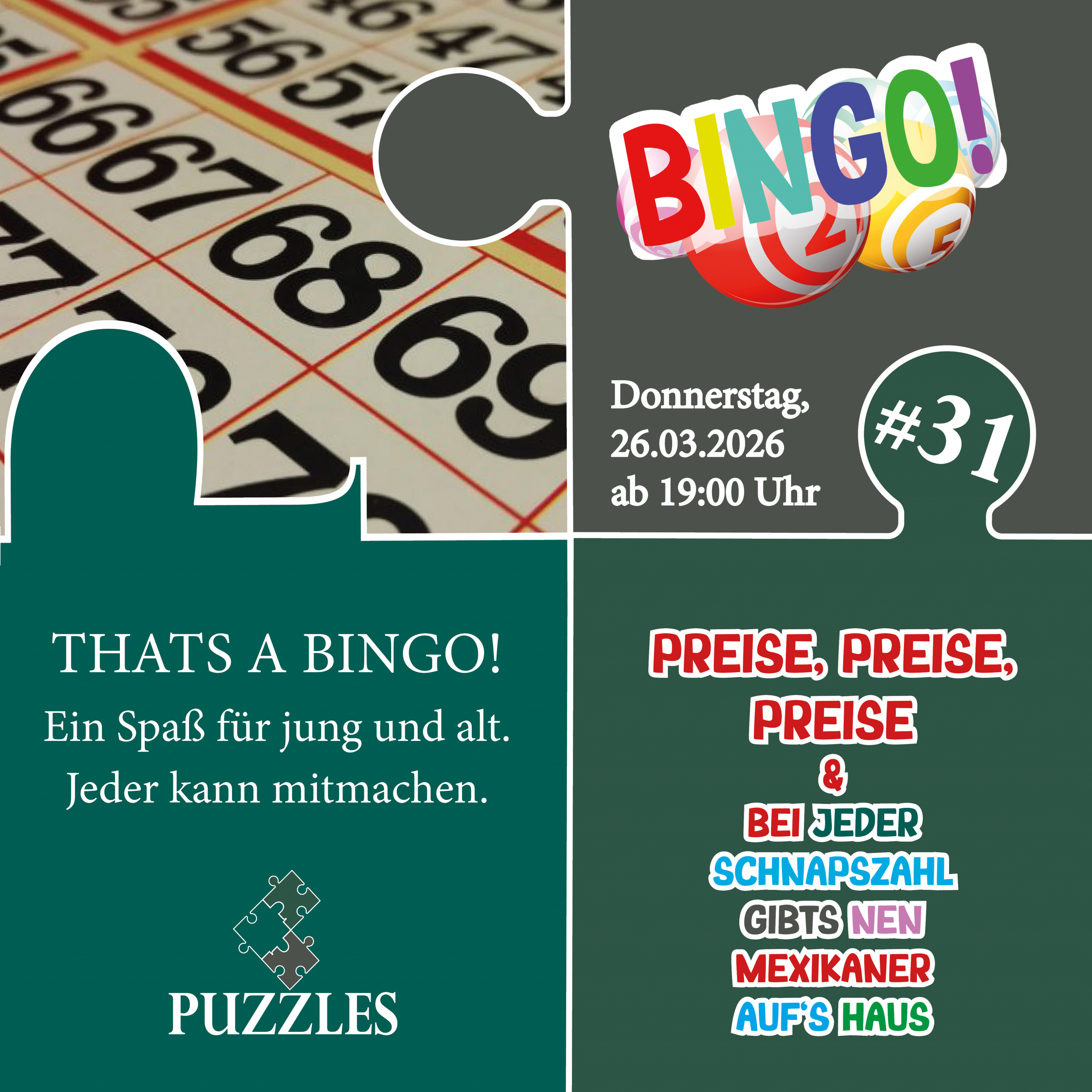 Puzzles Brilon Petrusstraße 1, Brilon, NRW, DeutschlandBINGO #31 Donnerstag, 26.03.2026 ab 19 Uhr Wir finden, Bingo ist nicht nur etwas für den Ruhestand. 😉 Bei uns darf jeder mitmachen, von jung bis alt und ohne Voranmeldung. Gespielt wird rundenweise und jede Runde gibt es etwas zu gewinnen. Außerdem gibt es bei jeder gezogenen „Schnapszahl“ eine Runde Mexikaner für alle. 🎉 Wir freuen uns wieder auf jeden, der Lust hat mitzumachen! 🙂 Eure Puzzles Crew 🧩