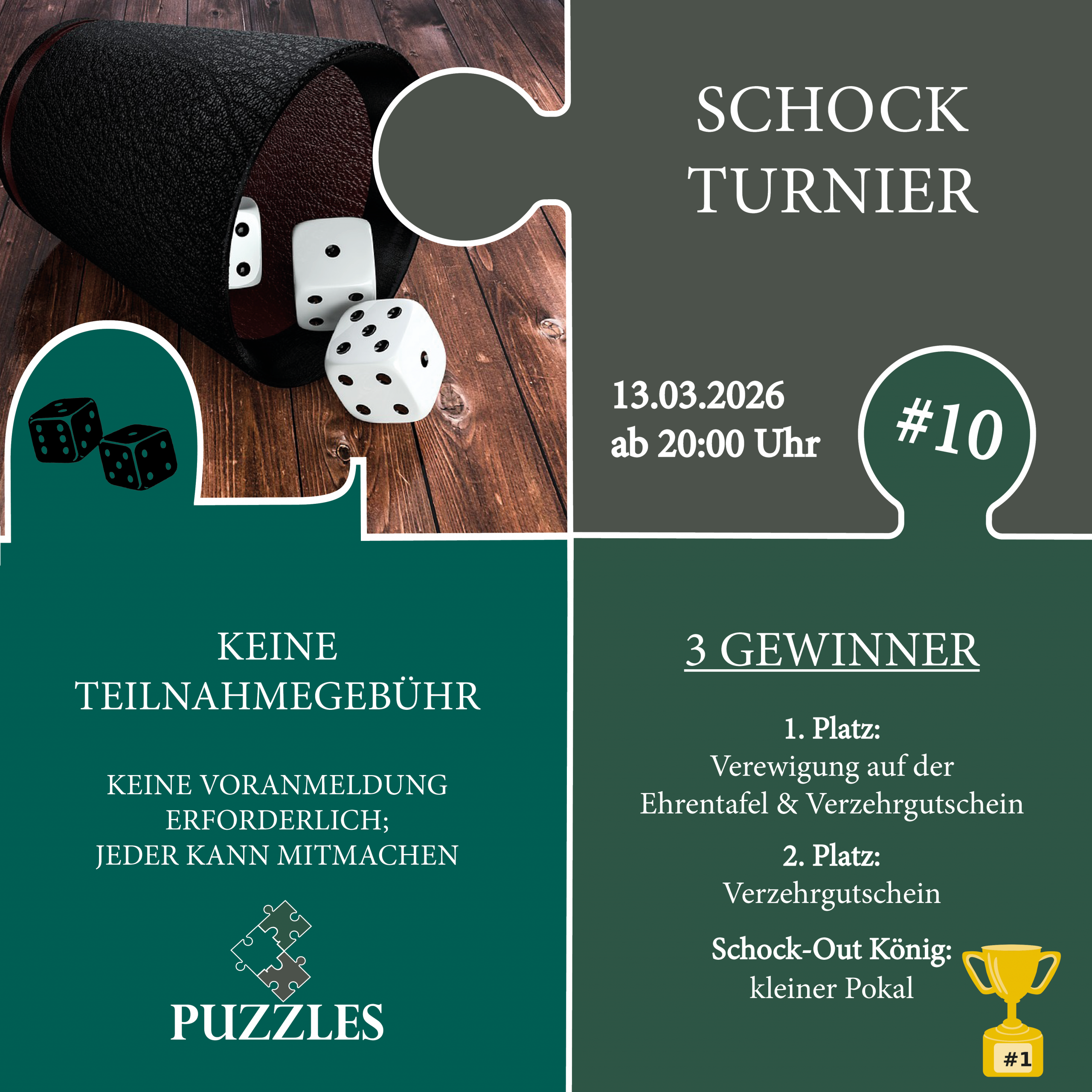 Puzzles Brilon Petrusstraße 1, Brilon, NRW, DeutschlandSchock Turnier #10 🎲 Freitag, 13.03.2026 ab 20 Uhr Die bisherigen Turniere haben schon einen riesen Spaß gemacht. Wir freuen uns auf alle, die nun wieder oder neu dabei sind. 😊 „Schocken“ ist ein simples aber spaßiges Kneipenspiel, dass Menschen zusammenbringt. Denn bei uns verbringt ihr den Abend mit unterschiedlichsten Leuten. Und gewinnen könnt ihr auch noch etwas, nämlich… Der Gewinner wird auf unserer Ehrentafel verewigt und darf sich zudem auf einen Verzehrgutschein freuen. 🥇 Auch der zweitplatzierte bekommt einen Verzehrgutschein. Außerdem prämieren wir den Schock-Out König des Abends mit einem kleinen Pokal. 🏆 Es wird nach altbekannten Regeln gespielt, die am Abend noch mal erläutert werden. Jeder kann, ohne Voranmeldung, teilnehmen. Pünktlichkeit wird aber vorausgesetzt. 😉 Wir freuen uns auf euch! Eure Puzzles Crew 🧩