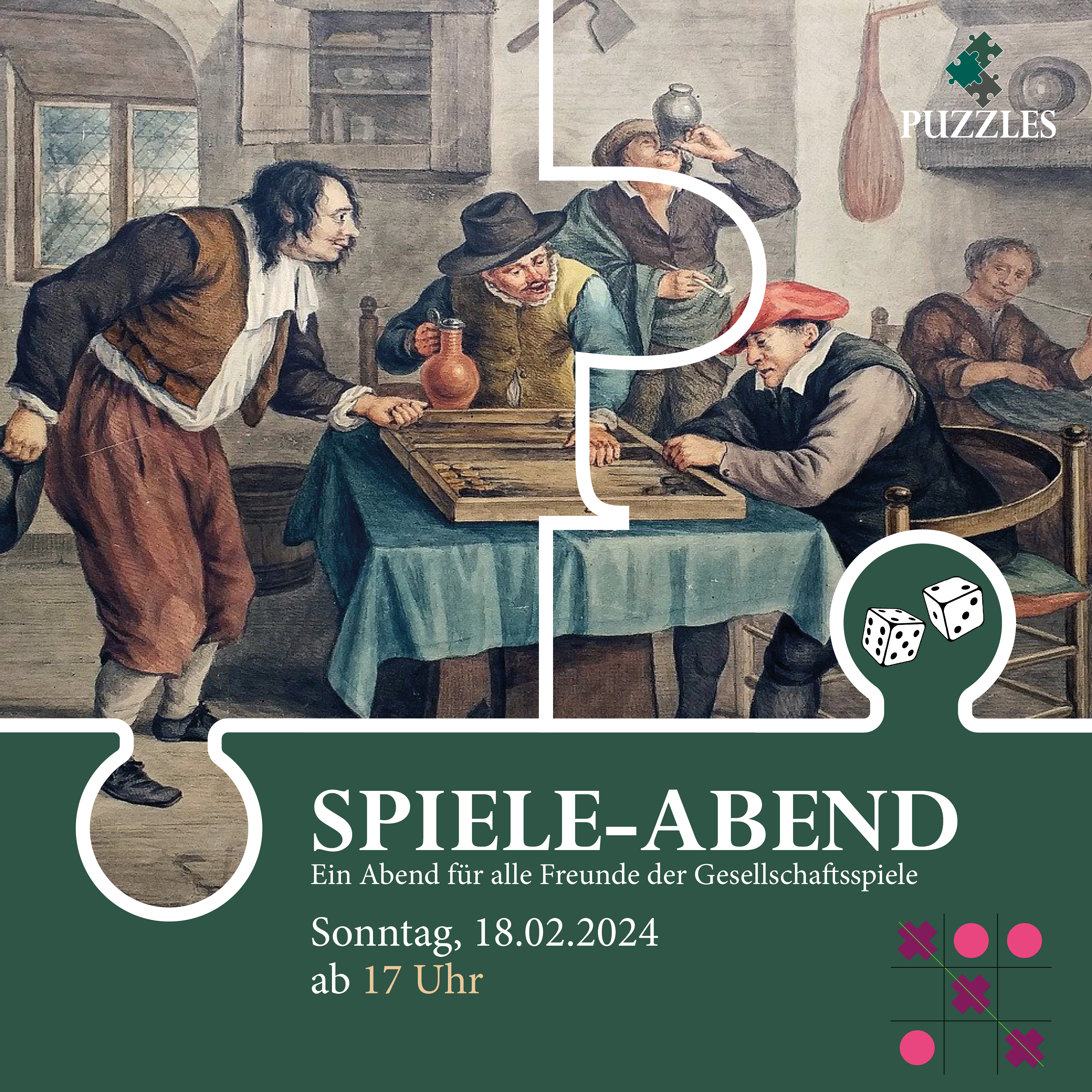 SPIELE-ABEND 🎲♟️ 18.02.2024 ab 17 Uhr. Wir öffnen diesen Monat das Puzzles zu einem etwas anderen Kneipenabend. Am Sonntag, den 18.02. dreht sich alles um Gesellschaftsspiele. Natürlich bekommt ihr auch an diesem Abend den vollen Service des Puzzles. Nur die Musik wird eine Nebenrolle spielen. 😉 Vor Ort werdet unter anderem folgende Spiele finden: – UNO – Schach – Spielesammlung – Dog – Schocken – Backgammon – Monopoly – 6 nimmt – Werwölfe – Kartenspiele Ihr dürft euer Lieblingsspiel natürlich auch gerne mitbringen für den Abend. 🙂 Wir freuen uns auf euch! Eure Puzzles Crew 🧩