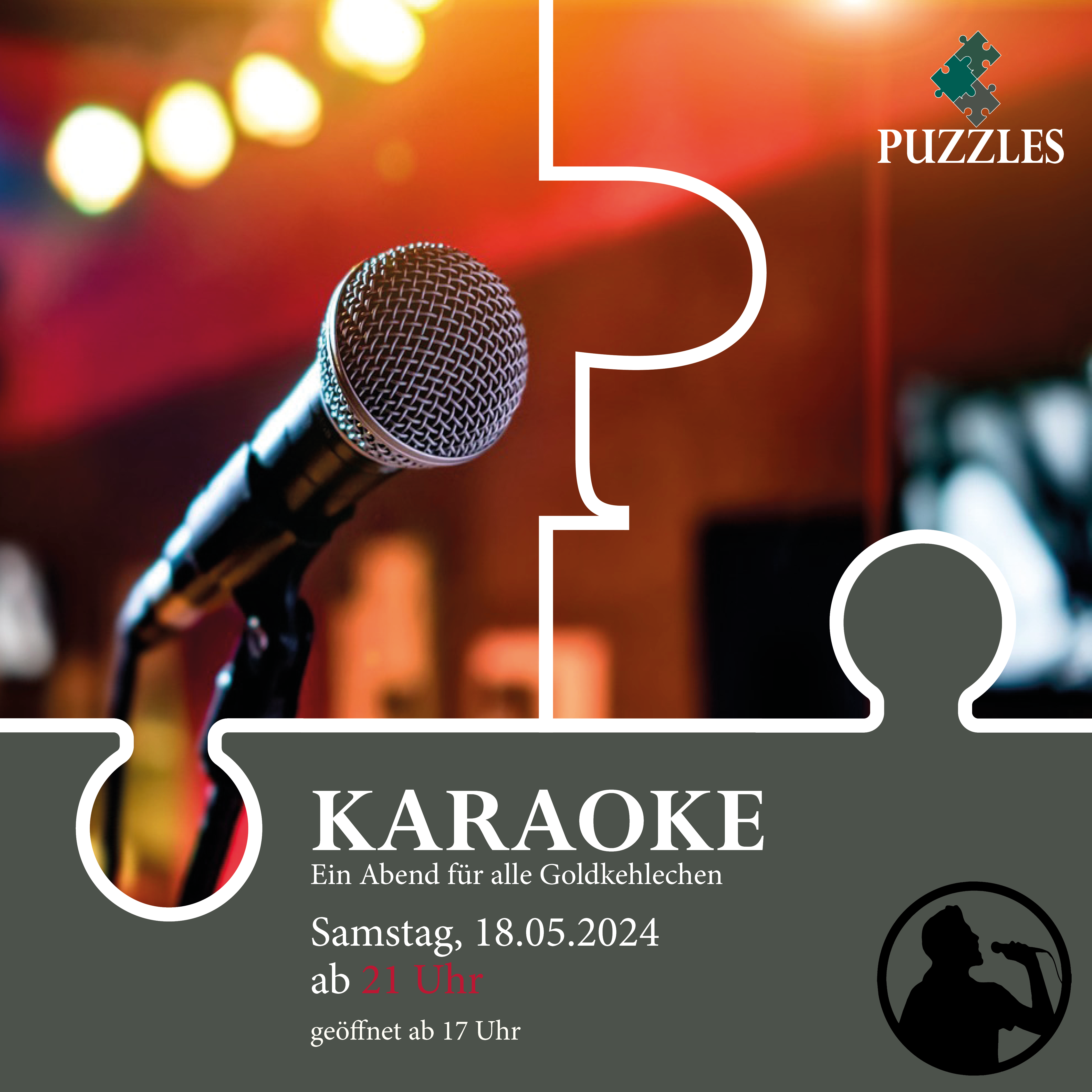 KARAOKE! Samstag, 18.05.2024 ab 21 Uhr. ab 17 Uhr geöffnet. Es wird wieder Zeit, dass ihr für das Entertainment sorgt. Kommt rum, wählt auf „karafun.de“ einen von über 75.000 Songs aus, schnappt euch das Mikro und begeistert uns mit euren Gesangstalenten. 🙂 Wir freuen uns auf euch! Eure Puzzles Crew