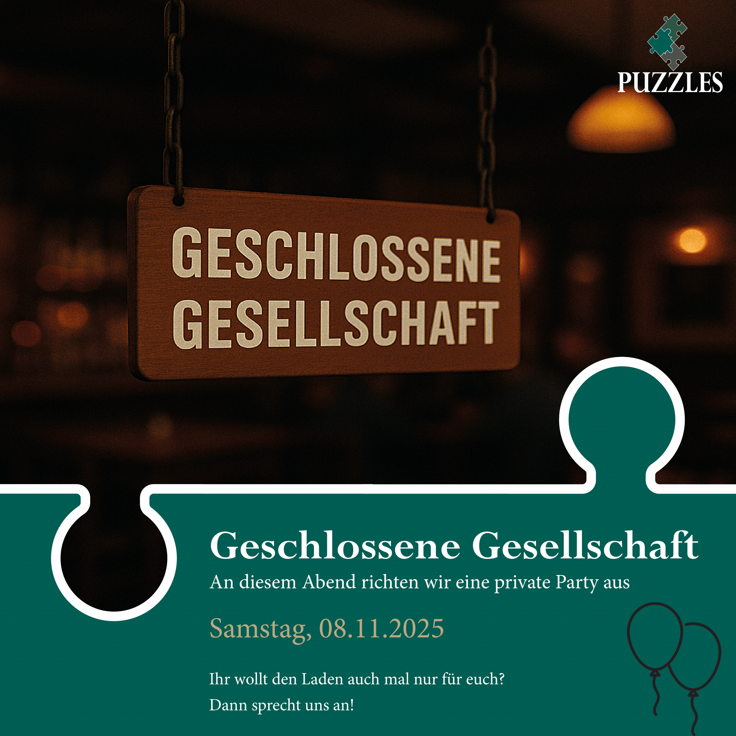 FRIGHT NIGHT! 🎃 Freitag, 31.10.2025, ab 17 Uhr. Die diesjährige Halloween Nacht steht, im Puzzles, ganz im Zeichen des klassischen Horrors. Ihr dürft euch freuen auf: – unterschiedlich gestaltene Themenbereiche – Special Drinks, die es nur an diesem Abend geben wird – Shot-Spritzen – „gruselige“ Snacks Und natürlich musikalisch alles, was das Herz begehrt. ☺️ Wir freuen uns schon sehr auf alle Mumien, Zombies, Vampire und andere Wesen der Nacht… ☠️🌚 Eure Puzzles Crew 🧩